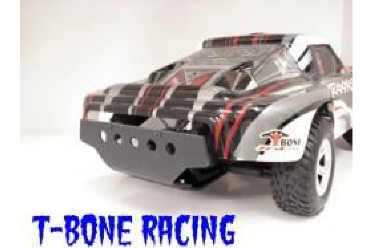 The T-Bone Racing The SC Racer rear bumper is made of nylon and mounts to the skid with two screws and lock nuts and to the stock support arms with two screws. The skid portion mounts under the chassis with four screws.