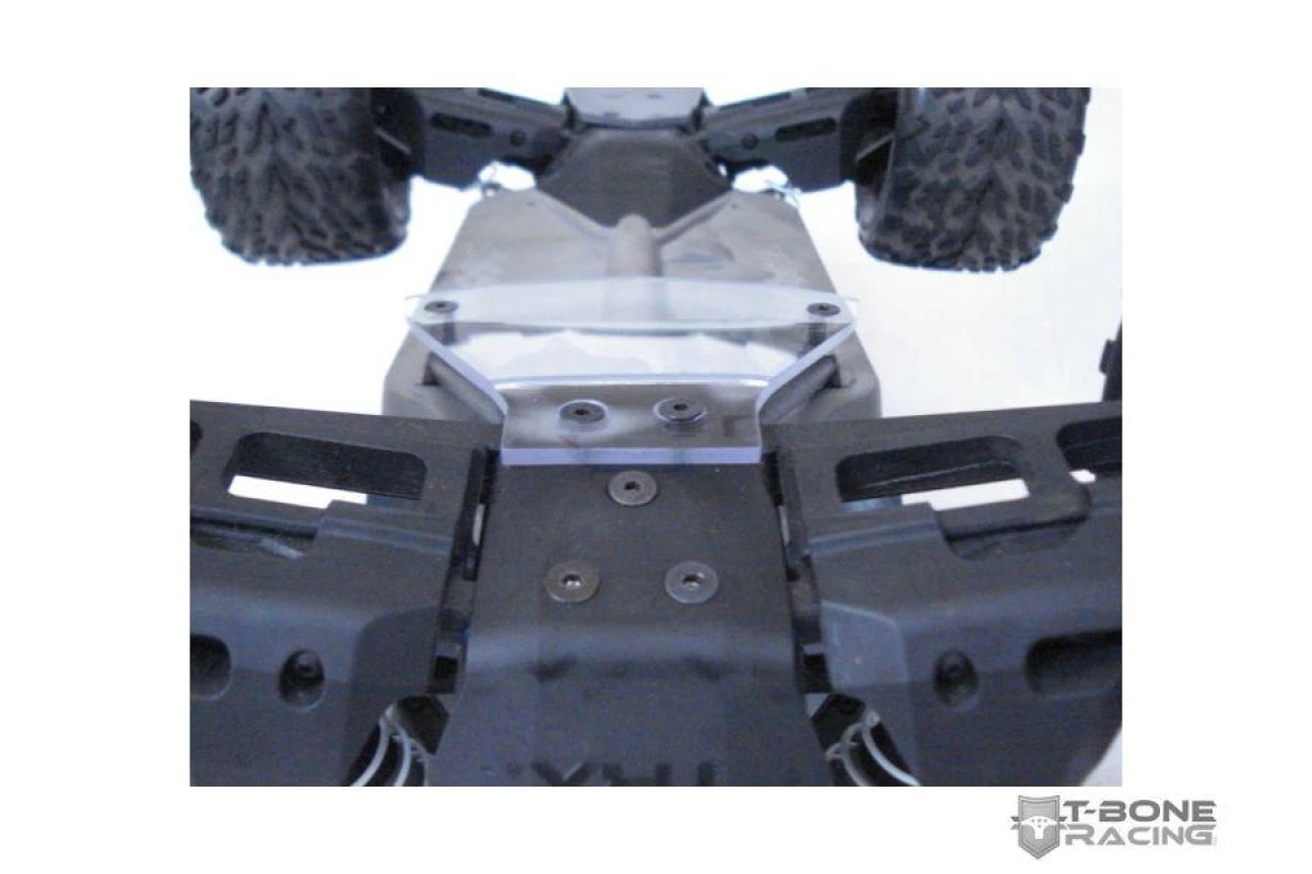 T-Bone Racing servo Guard is made of Clear Polycarbonate and comes with the necessary hardware to mount it. It is raised off the chassis in order to clear the servo. Using the R2 design the servo guard has been updated to provide better clearance for the front A-ArmsNote: These are made to mount with our bumpers. If you use your stock bumper, the leading edge of the servo guard will not be flush with the bottom of you chassis.
