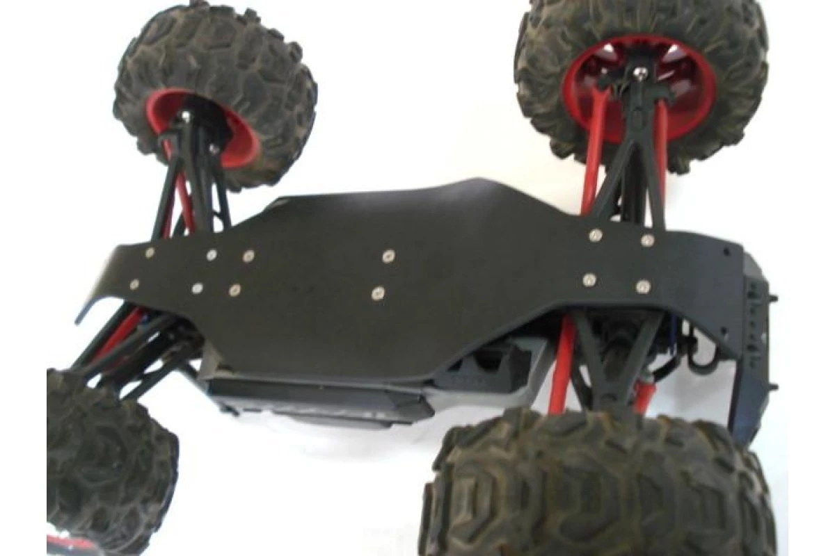 T-Bone Racing chassis brace for the 1/16 Summit is made of .125″ black nylon and weighs 2.5 ozs. It is mounted with 12 screws to spread the impact accross the whole lenght of your chassis. We use aluminum spacers to mount between the stock skid/chassis and our brace, providing clearance for the A-Arms. The brace comes with 3 holes front and rear to mount the bumpers (not included) If you already have a T-Bone front Thrasher and rear Monster, you can modifiy them to bolt on to the chassis. A dremel tool will work fine.Does not come with front and rear bolt on bumpers and uses a different mounting bracket than the 1/16 E-Revo.