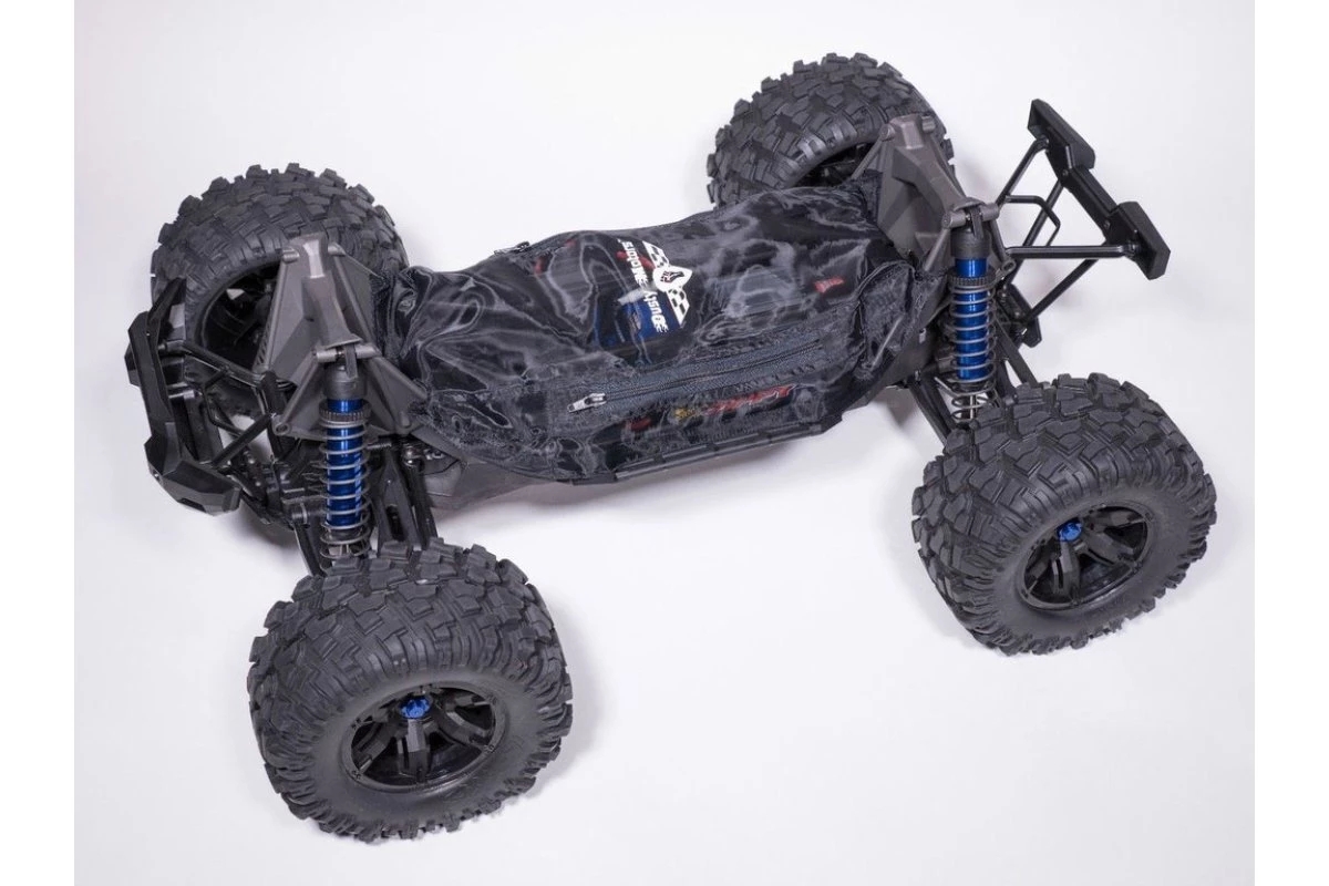The Dusty Motors Traxxas X-Maxx Protection Cover Shroud is a high quality, hand made, dust and water splash proof shroud. Shroud comes with a zipper, which allows to access the internals of the model – i.e. connecting/disconnecting batteries and turning a model on/off without removing a shroud. While taking a break between the running stints the shroud can be unzipped to allow ESC and motor to cool quicker. Shroud is made from the highest quality materials. That is why it is strong, durable and efficient. The open area of a material is more than 50% of total shroud surface, so it ensures a very good airflow in order to keep the model electronics cool.